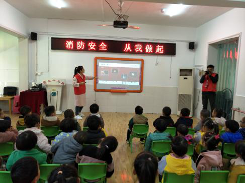 志愿者們根據幼兒年齡小、理解能力較弱的特點,利用卡通圖片及簡潔易懂的小兒歌,就火災的危害性、119報警注意事項、疏散逃生要點及滅火器使用方法等消防安全常識進行了詳細講解。