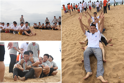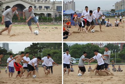 通過前面三個緊張的比賽之后,決出了四個隊(duì)伍進(jìn)行終極項(xiàng)目—沙灘足球比賽。比賽中我們?nèi)w成員手拉手圍出了一個足球場,大家既是邊界,又是觀眾,參與感非常強(qiáng)。每一次斷球,都有搶奪競爭對手客戶時的喜悅;每一次傳球,都是團(tuán)隊(duì)隊(duì)員相互之間的信任;每一次帶球奔馳,都像手握項(xiàng)目漏斗有底氣;最后的臨門一腳,像揮灑汗水拿到了訂單,充滿了愉悅??粗蠹以诮鹕成吓ζ床臉幼?,我們激情高漲,抬頭看了看海的遠(yuǎn)方,心中充滿了愛與喜悅。