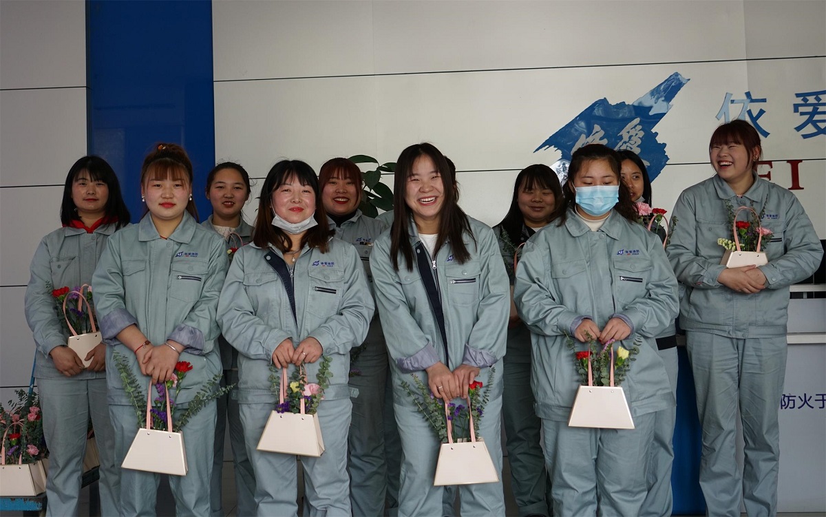 活動(dòng)當(dāng)天上午,各部門女員工代表前往A12廠房一樓大廳,領(lǐng)取了婦女節(jié)的慰問品和鮮花。并合影留念。