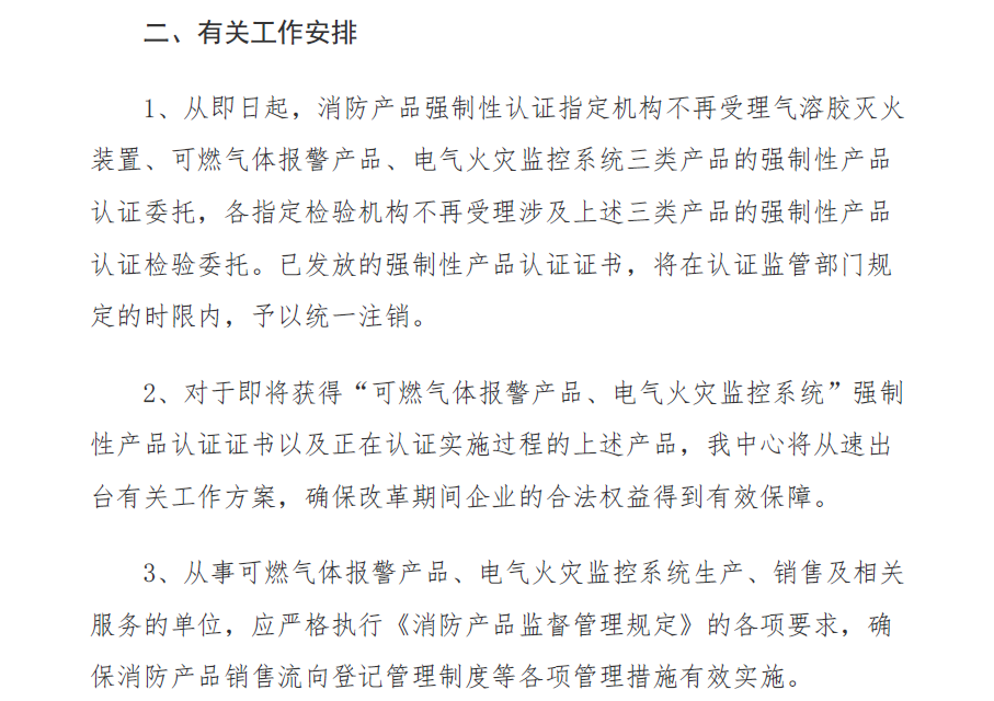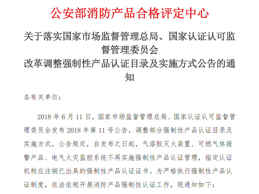 公告規(guī)定,自發(fā)布之日起,3類消防產品(即氣溶膠滅火裝置、可燃氣體報警產品、電氣火災監(jiān)控系統(tǒng))不再實施強制性產品認證管理,指定認證機構應注銷已出具的強制性產品認證證書。同時國家認監(jiān)委注銷相關認證機構和實驗室所涉及的強制性產品認證指定業(yè)務范圍。